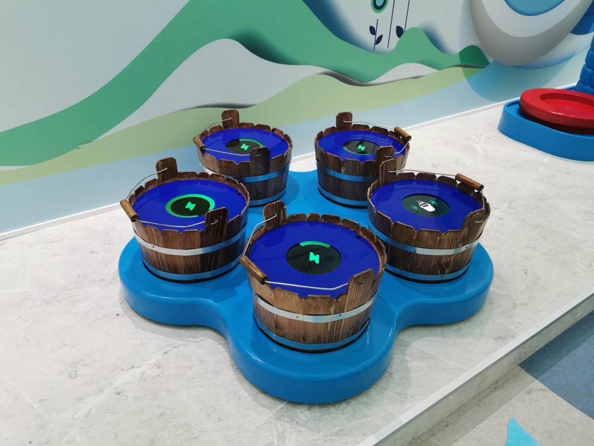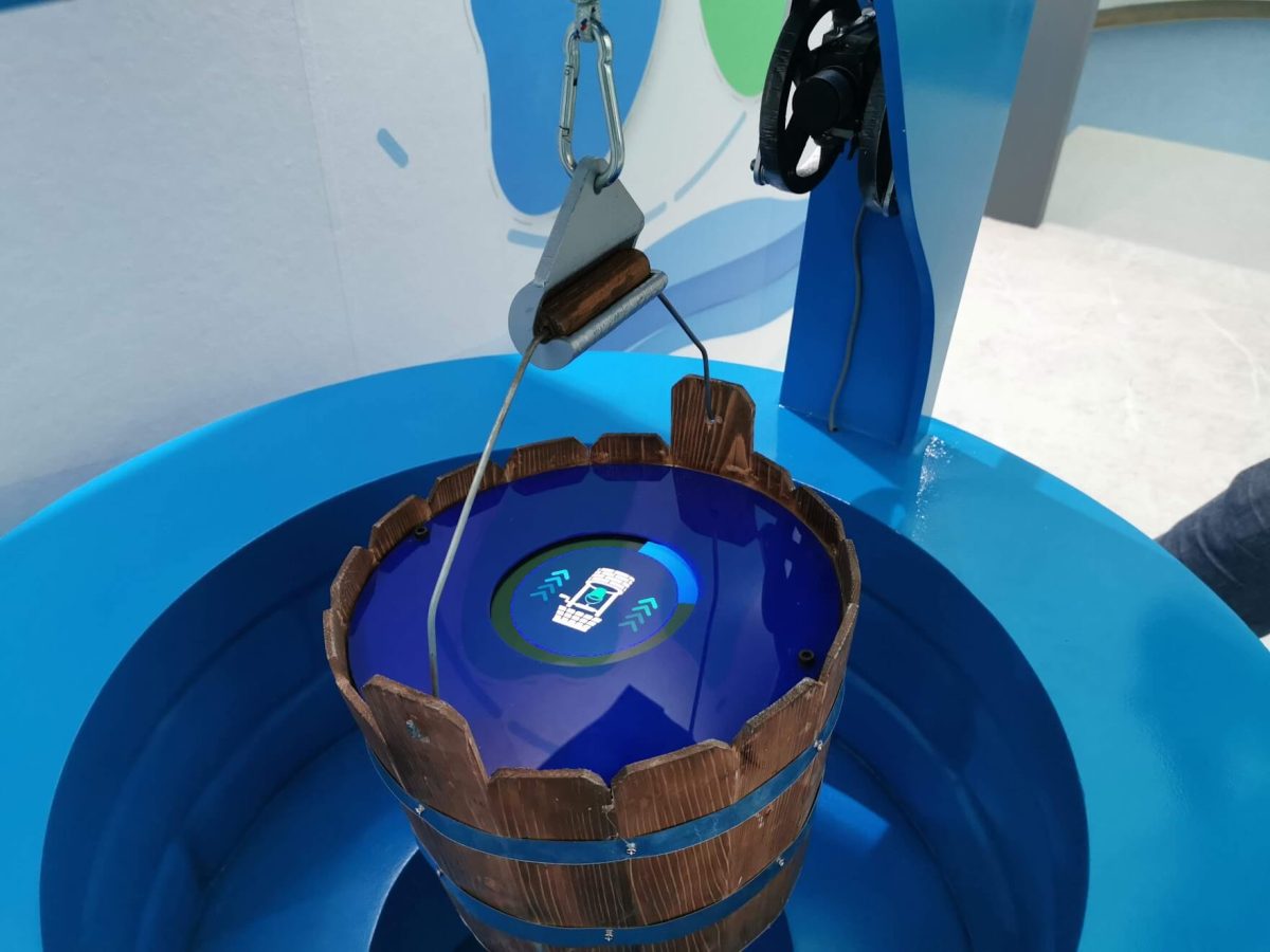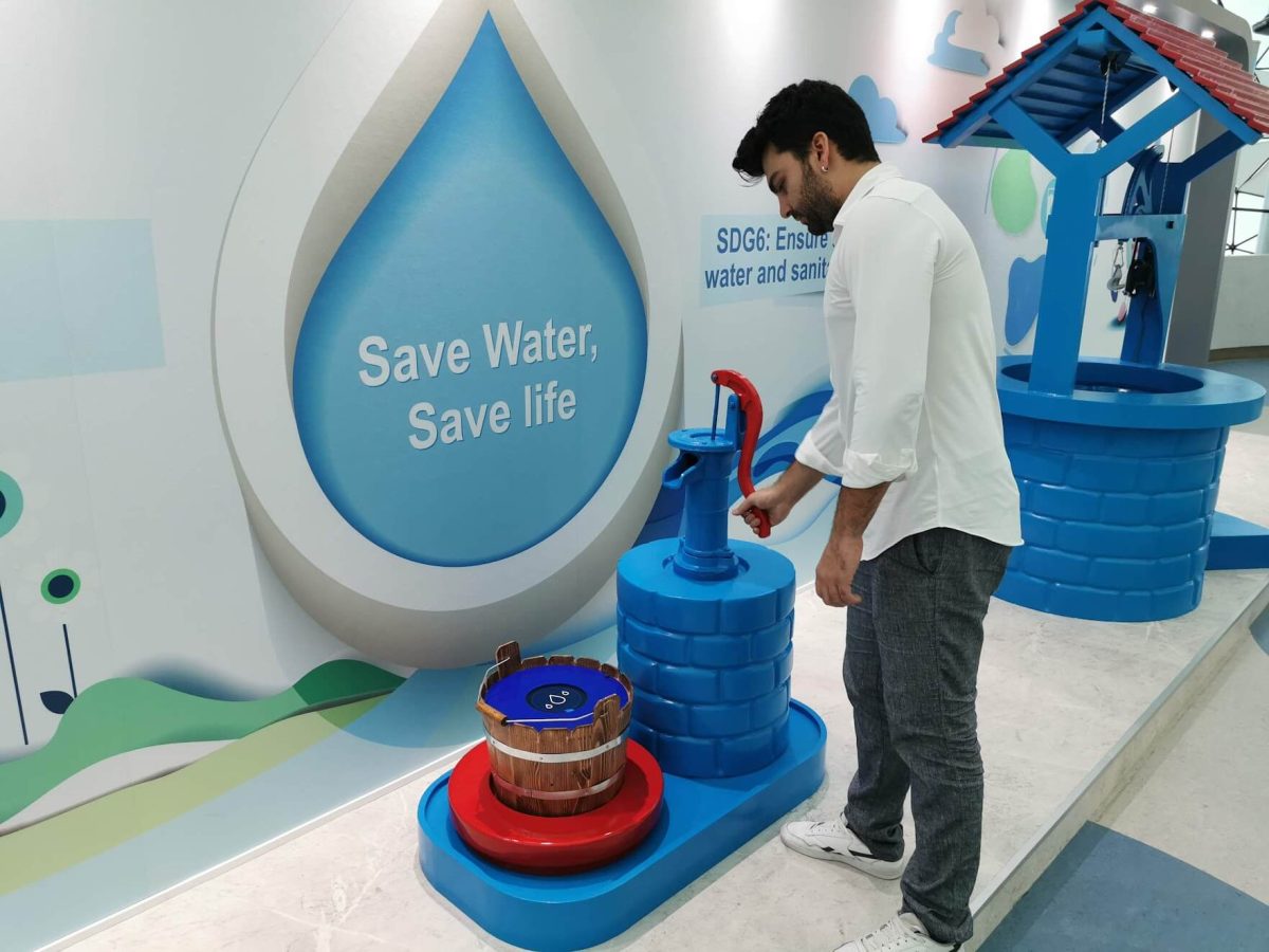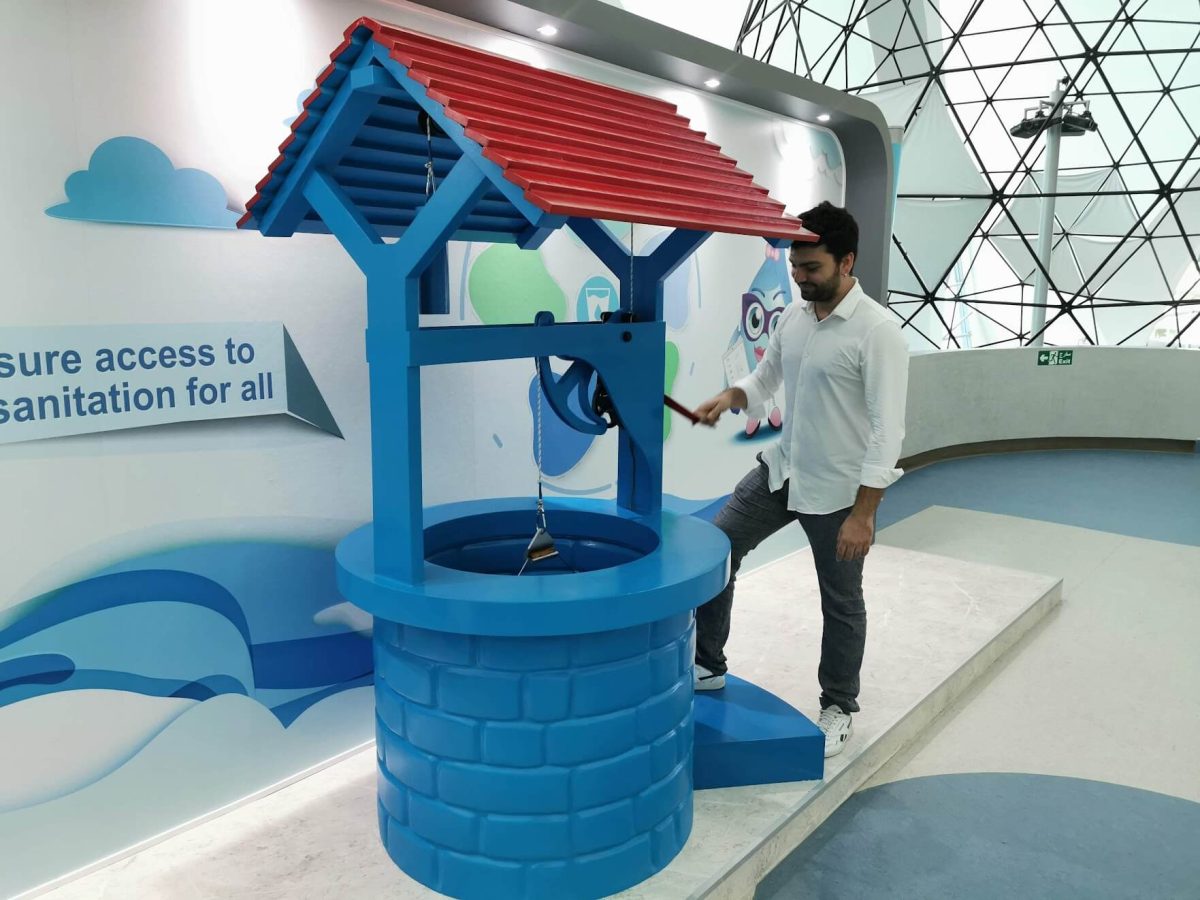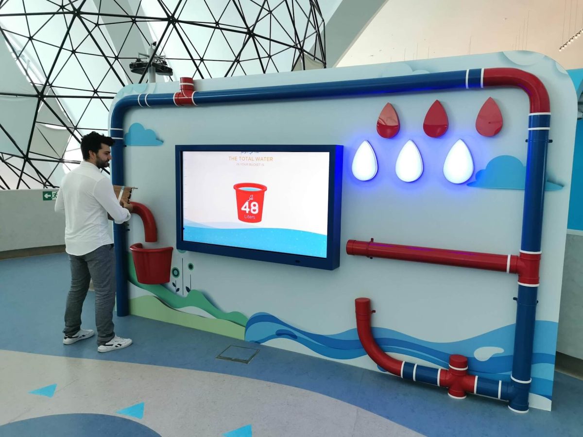 İnteraktif duvar sayesinde suyun arıtılma sürecini öğrenen ziyaretçiler, dijital kovalar aracılığıyla pompalar ve kuyularla etkileşime geçerek kovalarını dijital suyla dolduruyorlar.