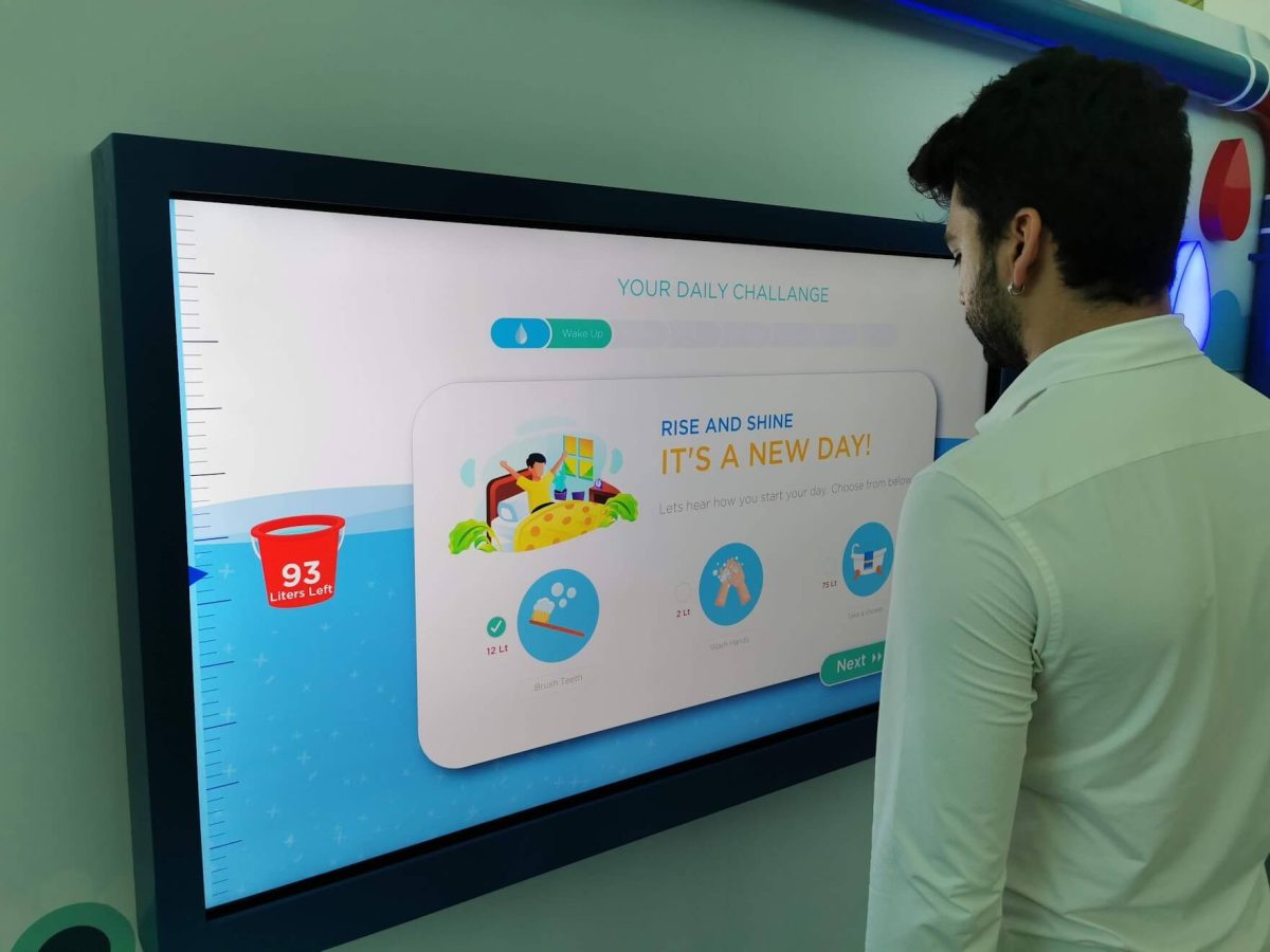Fiziksel deneyimin sonunda, ziyaretçiler getirdikleri suyu ekranın haznesine aktarıp, ardından ortaya çıkan soruları yanıtlayarak 1 günlük su ihtiyaçlarını karşılamaya çalışıyorlar. Bu interaktif soru-cevap etkileşimi, ziyaretçilerin su tüketimi ve tasarrufu konusundaki bilgilerini sınama ve geliştirme fırsatı sunuyor.